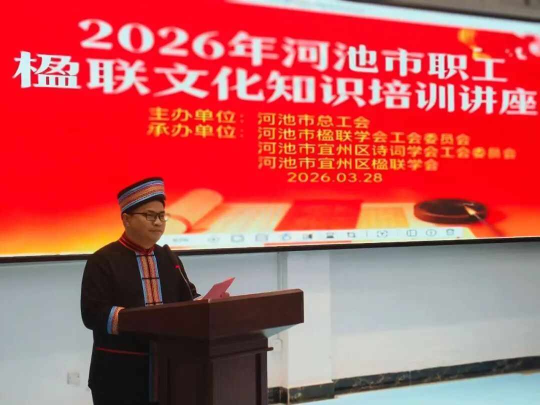 3月28日,楹联知识培训在宜州区龙溪书院举办,60余名职工楹联爱好者参加。来自中国楹联学会柳州函授院及河池市楹联学会的三位专家围绕楹联基础知识、平仄对仗、创作技巧等内容进行系统讲解,并结合“劳动美”“工匠精神”“民族团结”等主题开展实操训练,帮助学员在创作中传承中华优秀传统文化。